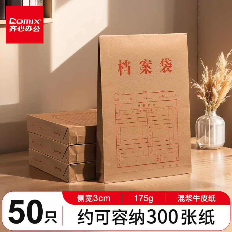 齐心(COMIX)50只装175gA4竖式牛皮纸档案袋侧款3cm文件袋/资料袋标书合同文件票据袋 办公文具EA6023