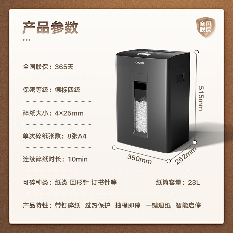 得力(deli)办公室专用碎纸机4级保密单次8张碎纸23L大型商务京东自营家用文件A4纸粉碎机 带钉碎纸 GA311